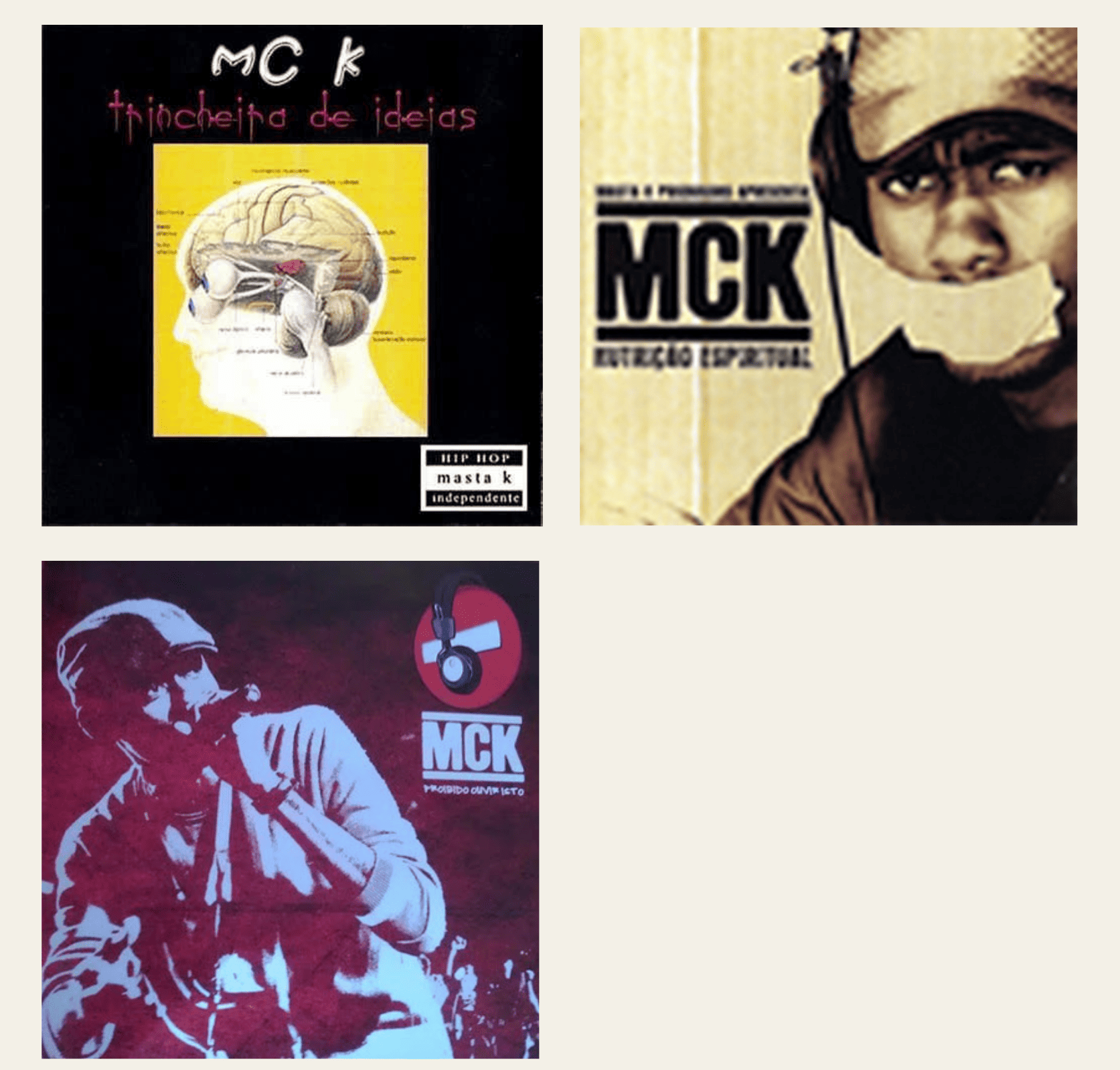 Há muito tempo queria falar sobre os álbuns “Trincheiras de Ideias” (2002), “Nutrição Espiritual” (2006) e “Proibido Ouvir Isto” (2011). Talvez você se pergunte de quem são esses clássicos, mas claro que todos pertencem a MCK.
